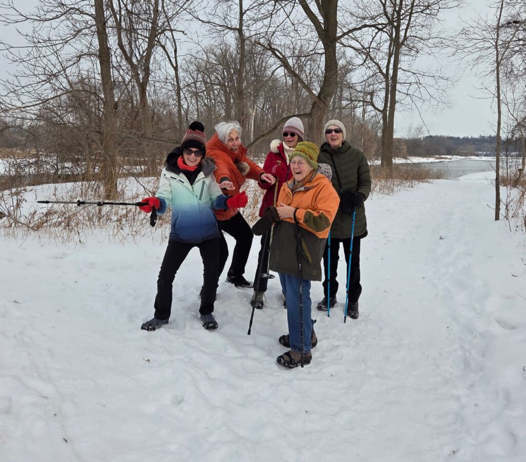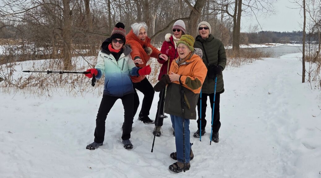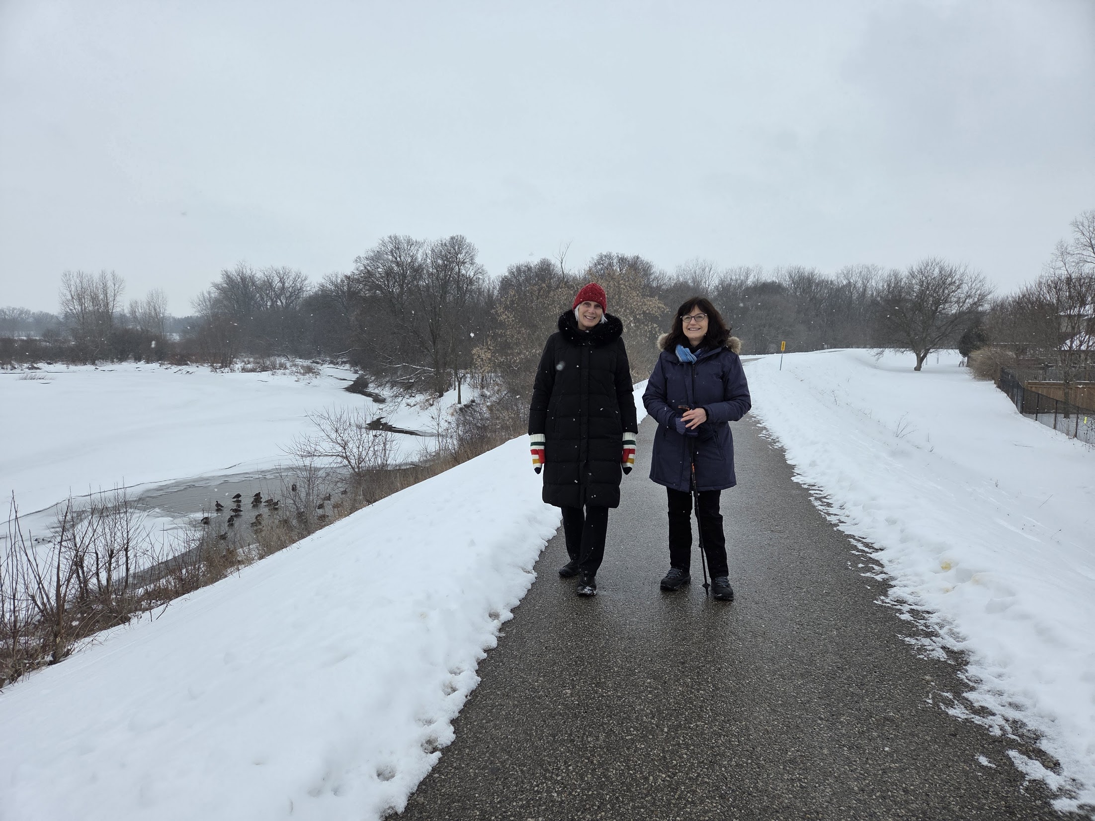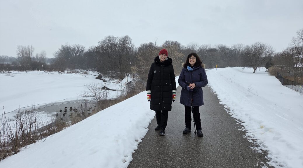 During the winter, our walking group spreads out to different venues. Some like to walk indoors at the Gretzky track in icy weather, while others like to walk through the woods. Three of us today walked on the dike and admired the ducks, the cardinals, and interesting and cute blue bird, and some impressively obedient dogs.