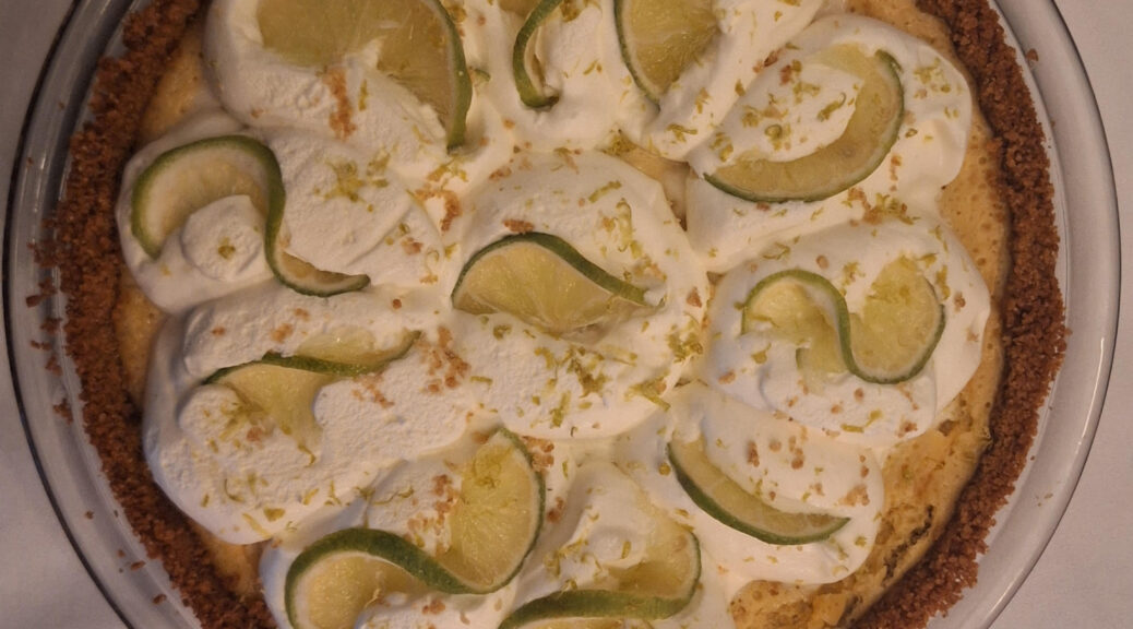 The food for thought group meet on april 6, 2026. Dinner and conversation were lovely but the highlight of the evening was the key lime pie made by Barb S. which was a work of art.